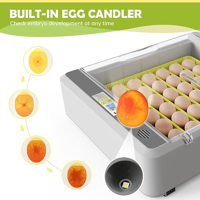 - š¤š¤ćAutomatic Egg Turning Functionć--The egg incubator can adjust the bracket according to the size of the eggs and automatically turn the eggs every 2 hours to ensure uniform heat distribution and stable temperature during the incubation process to increase the incubation speed and reduce human intervention. Check embryo development during incubation using the built-in LED egg candle holder to easily check egg development.