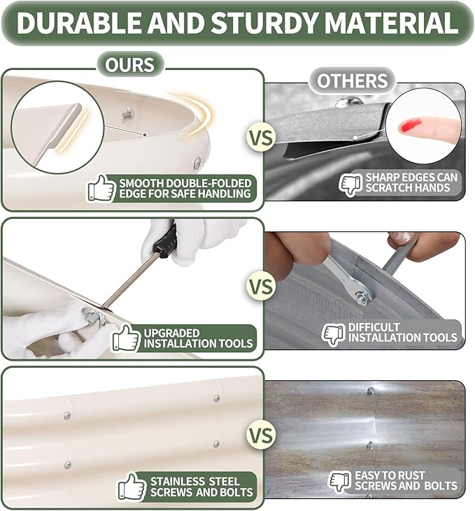 - 【High-Quality Materials & Durable】 Made from 0.7mm galvanized metal panels with double-layer anti-corrosion galvanization, this outdoor raised garden bed features a robust oval-shaped design for added strength and durability. Resistant to rust and corrosion, it provides a long-lasting gardening solution that can be reused for many years, ensuring a sustainable and reliable space for your plants to thrive