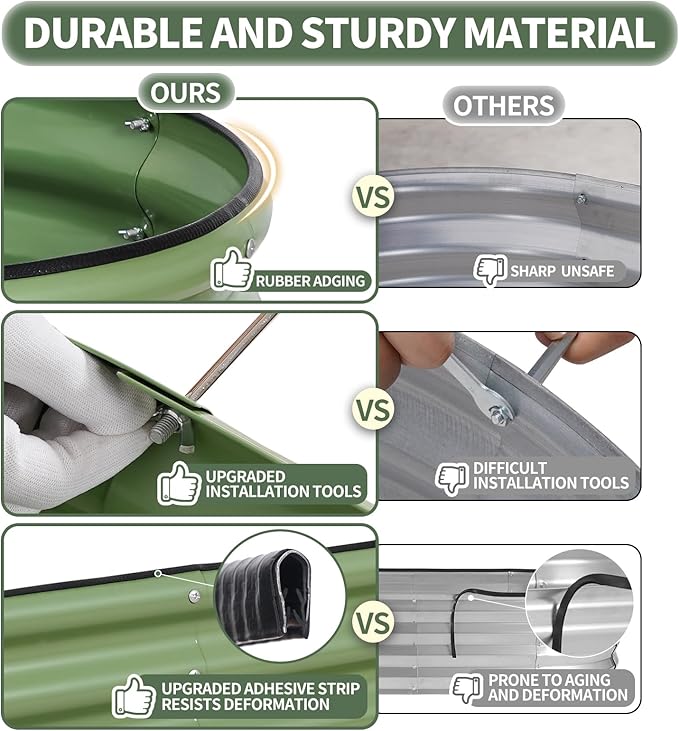 - 【High-Quality Materials & Durable】 Made from 0.5mm metal panels with double-layer anti-corrosion, this outdoor raised garden bed features a robust oval-shaped design for added strength and durability. Resistant to rust and corrosion, it provides a long-lasting gardening solution that can be reused for many years, ensuring a sustainable and reliable space for your plants to thrive