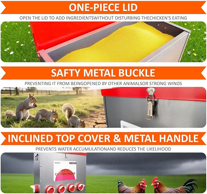 - 【Lock Down Savings & Stop Waste】 Our automatic chicken feeder's animal-proof lock and precision feeding ports virtually eliminate costly spillage and prevent animals like raccoons from stealing your valuable feed, maximizing your investment.