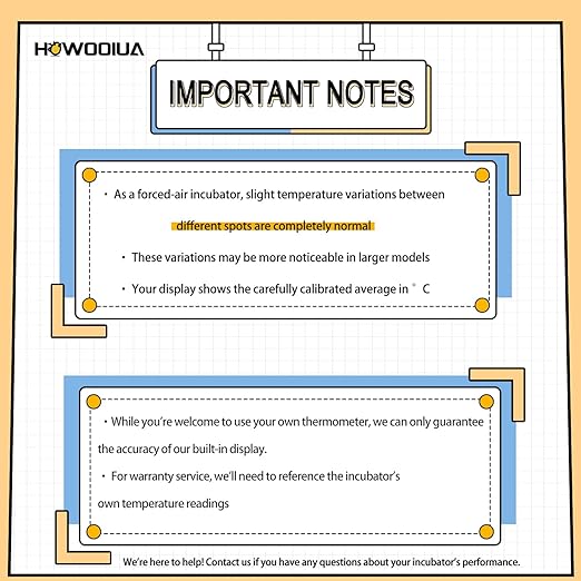 - 【Dual Protection (Alarm + Ventilation)】 ◆ Audible alarm triggers if temperature deviates ±1°C or humidity fluctuates ±5% ◆ 3D airflow design prevents hot spots ◆ Pro Tip: Calibrate sensors by letting the unit rest for 2 hours before first use. Minimize lid openings during incubation.