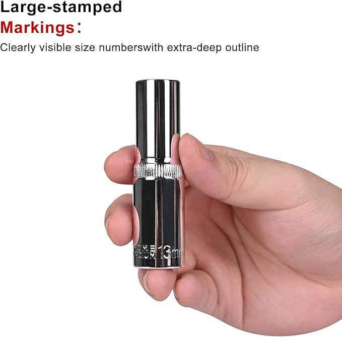 - 【SPECIAL DESIGN】 The sockets feature off-corner loading technology, which virtually eliminates fastener rounding. Each socket is equipped with large, permanent, high-visibility steel stamps. One of these stamps indicates the size, allowing for quick and easy selection during operation.