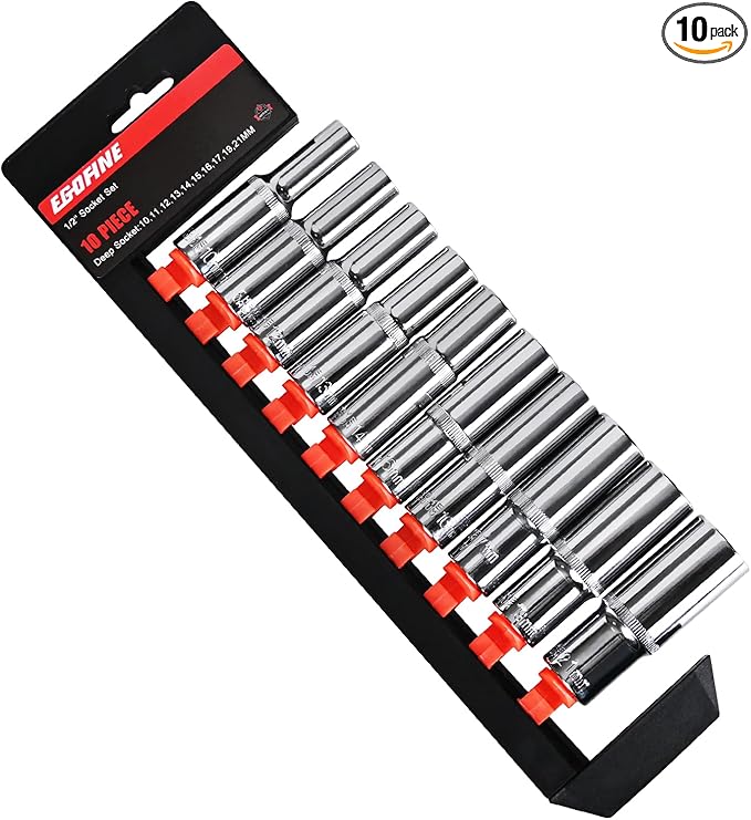 - 【MULTIPLE SIZES】The 1/2" drive 6-point deep socket set includes 10 sockets in the following sizes: 10mm;11mm;12mm;13mm;14mm;15mm;16mm;17mm;19mm;21mm. These sizes should cover most of your basic needs.
