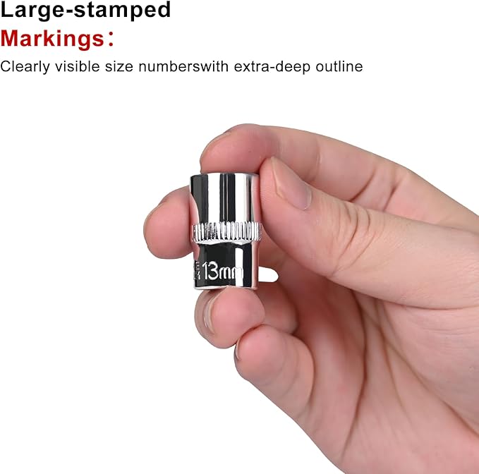 - 【SPECIAL DESIGN】 The sockets feature off-corner loading technology, which virtually eliminates fastener rounding. Each socket is equipped with large, permanent, high-visibility steel stamps. One of these stamps indicates the size, allowing for quick and easy selection during operation.