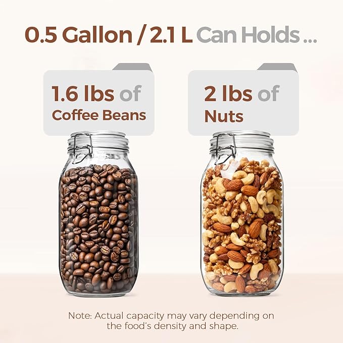 - Long-Lasting Freshness Jars: These kitchen canisters are perfect for long-term storage of dry goods like rice, pasta, or pet treats. The half gallon jars provide ample space for bulk foods, keeping food fresh and organized for extended periods