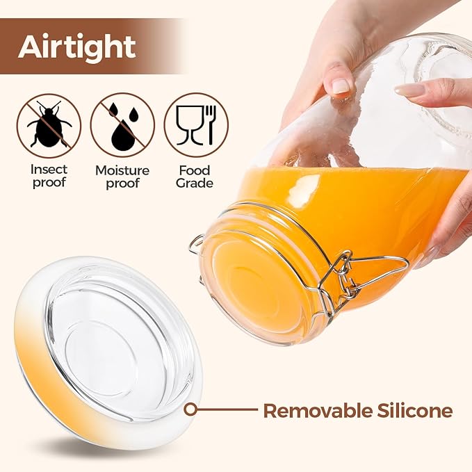 - Leak-Proof Large Jars: These 0.5 gallon mason jars boast a secure locking clamp and airtight silicone seal, ensuring leak-proof storage and keeping your food fresh and pest-free. Ideal for storing liquids like vanilla, juice,soups or sauces with no spills