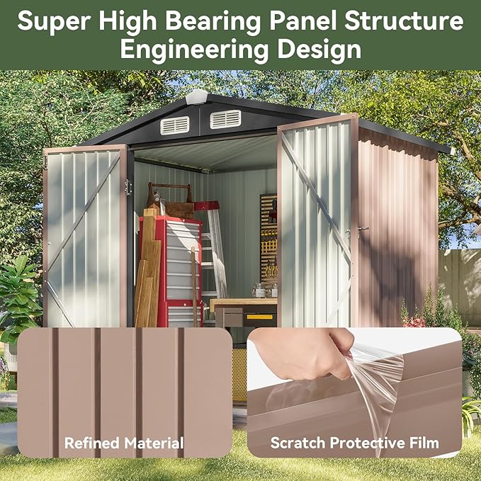 - Sturdy & Weather-Resistant Construction: Crafted with a robust frame and heavy-duty galvanized steel, this storage shed stands up to harsh weather conditions, ensuring a lengthy lifespan. Featuring a thick metal roof and reinforced wall panels, the shed offers exceptional stability. Wind Resistance: Up to Grade 6 (24-30 mph), Snow Load Capacity: Up to 6 inches