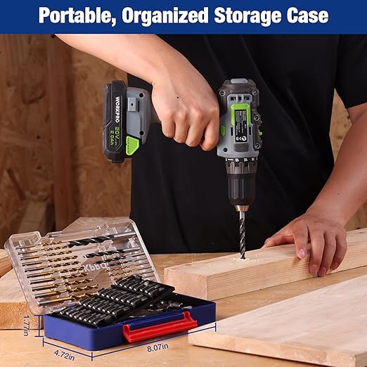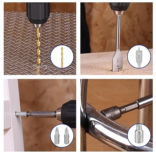 - PREMIUM MATERIALS FOR DURABILITY: The twist drill bits is made of HSS with titanium coating (HRC63–66), wood and spade bits crafted from heat-treated C45 steel (HRC42–50), and screwdriver bits made of Cr-V steel for long-lasting use.