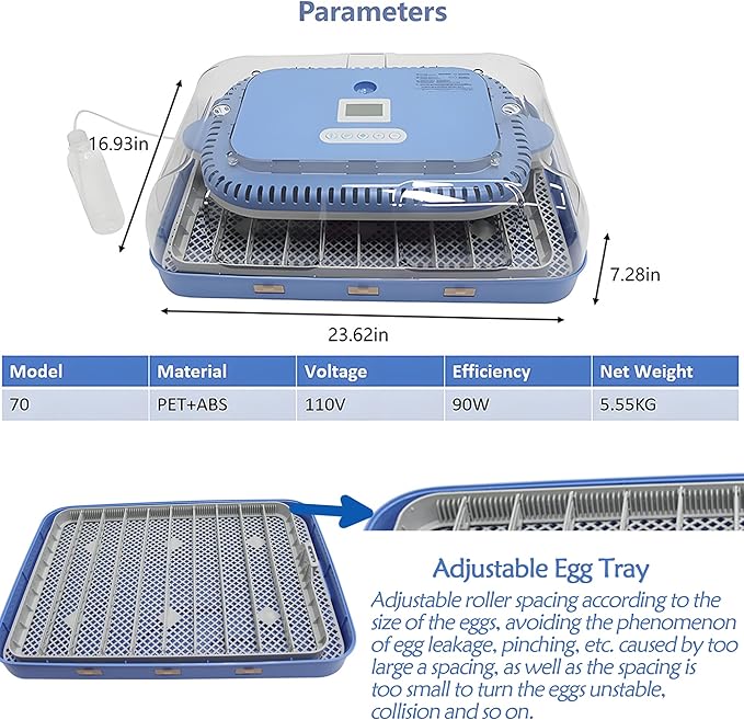 - 【Multi-functional design, applicable to a variety of scenarios】 Suitable for home, farm, laboratory and classroom, can incubate 70 chicken, duck or other bird eggs at the same time. Detachable chassis for easy cleaning, reduces odor, ensures hygiene and meets diversified needs.
