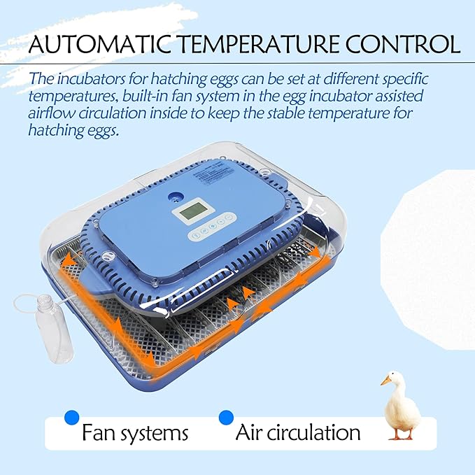 - 【Intelligent temperature control system ensures stable incubation environment】 Equipped with advanced automatic temperature control system to precisely regulate the internal temperature. Built-in fan circulates the airflow evenly to avoid temperature fluctuation, adapting to different seasons and maintaining constant temperature to enhance the hatching success rate.