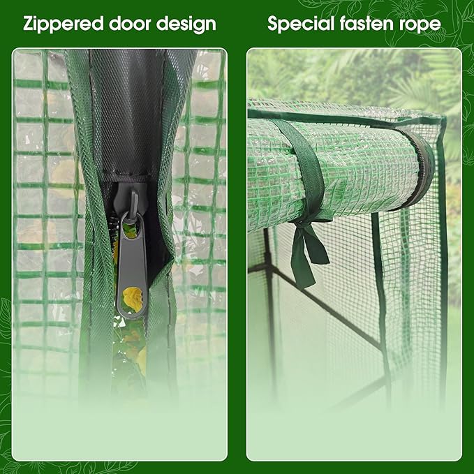 - Greenhouse Cover with Zippered Door : Protects plants from small animals and cold weather while acting as a warm shelter. Features a durable zippered door for easy access, adjustable ventilation, and year-round use.