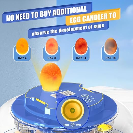 - 【360°View and Egg Candler Light 】 Without the need to open the incubator, 360° transparent lid that allows you to observe the egg development and hatching process more clearly. Equipped with a visual egg candler lighting on top of the egg incubator, convenient to observe the 21-day hatching progress and checking the egg's condition.It's both educational and fascinating for kids and curious individuals