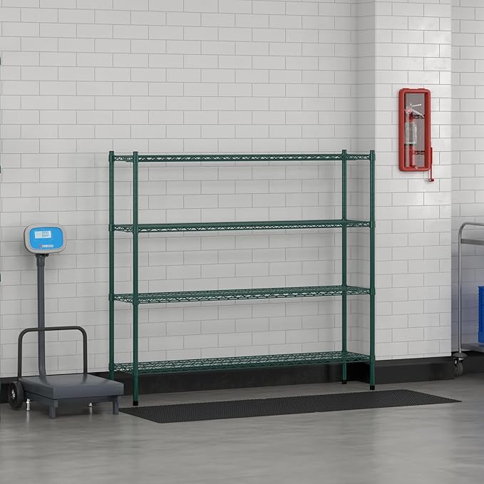- Places of Usage: With its durable green epoxy finish, this Shelving Kit provides reliable protection across various environments. The corrosion-resistant coating ensures long-lasting durability, even in humid or moist conditions. Ideal for securing inventory in commercial kitchens and dishrooms, storing perishable items in walk-in refrigerators and freezers, or protecting gardening tools and supplies in greenhouses.