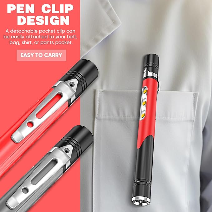 - 4 Versatile Lighting Modes - With a handy bottom switch, this rechargeable pen light has 4 modes. Main light: bright cuts darkness (hikes/late checks); soft low for reading/quiet nights. Side light: warm amber (glare-free household fixes) and blinking red (emergency signal). Easy to toggle, adapts smoothly to daily use/adventures