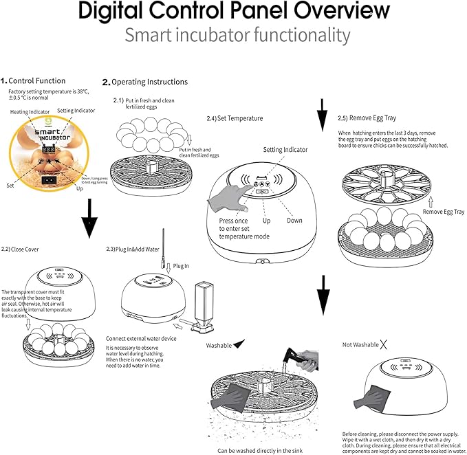 - [Built-in Egg Candler Light] This incubator includes a built-in egg candler, allowing you to easily monitor embryo development throughout the 21-day hatching cycle. The transparent lid offers a full 360° view for clear, uninterrupted observation of the eggs.