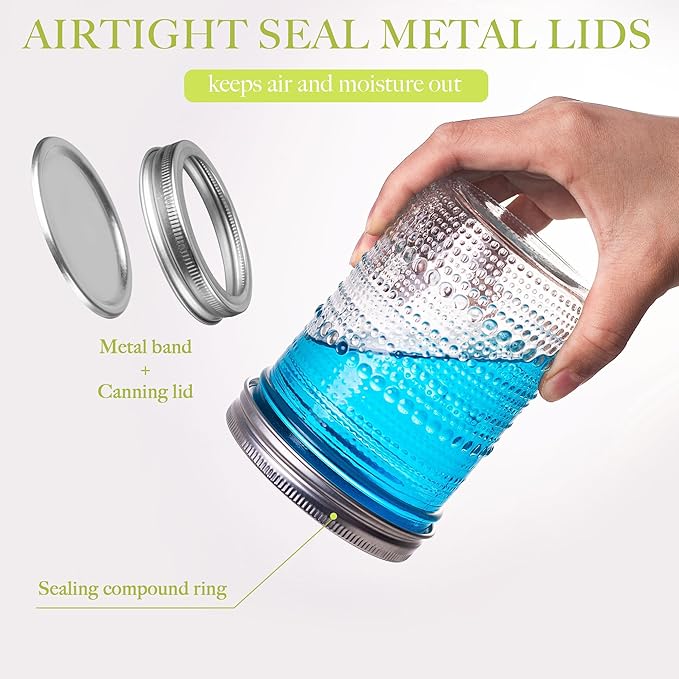 - AIRTIGHT SEAL: The split lid on mason jars consists of a metal canning lid and band, 16 oz mason jars metal band with an airtight composite ring. The two-layer airtight lid ensures glass mason jars don't leak, insulates against air and moisture, extends the shelf life of the mason jars wide mouth contents, and maintains freshness and flavor