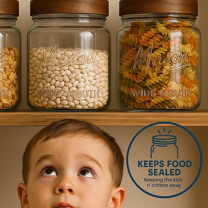 - These large mason jars with lids feature a natural wood lid design that brings a clean, modern look to your pantry, countertop, or open shelving, blending well with farmhouse, rustic, or minimal kitchen styles.