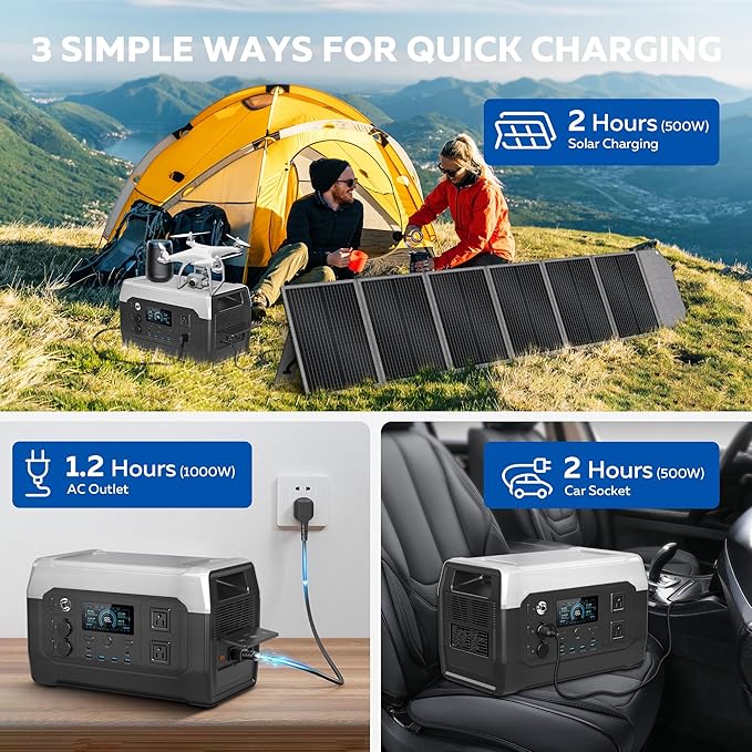 - [1 Hour Fast Charging]: With 1000W AC input, the portable power station achieves 90% recharge in just 1 hour. Solar charging reaches 100% in 2 hours with a 500W XT60 input. You can also recharge your power station through the car outlet on road trips. Always ready to go when you need it!