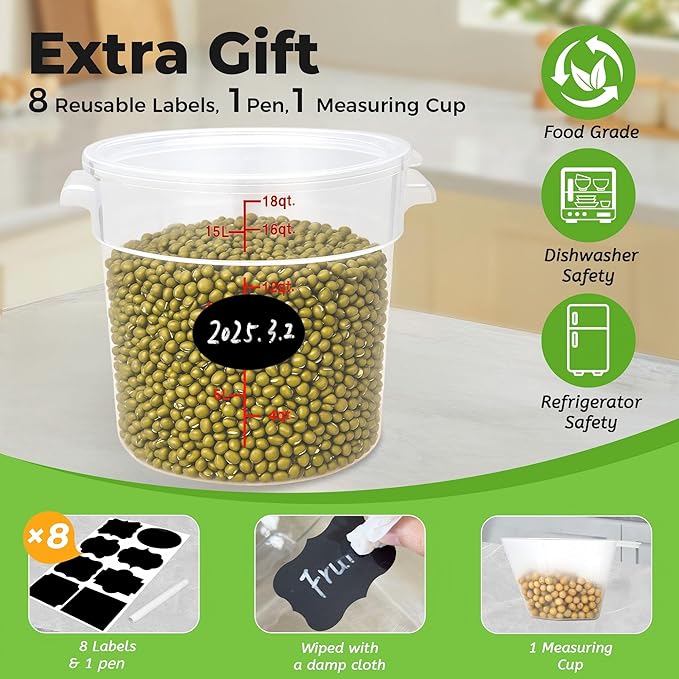 - Large Capacity: Includes 4×18QT food storage containers with lids, 8 reusable labels, a pen, and a measuring cup. Labels are wipeable for easy reuse. Ideal for bulk storage and better measurement