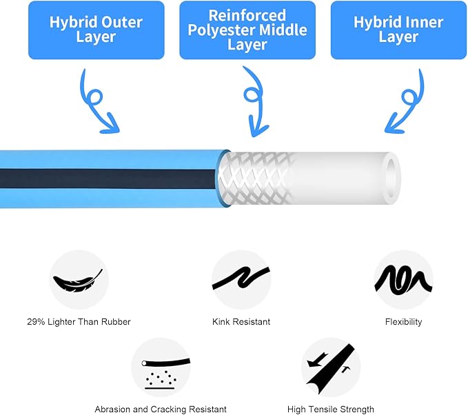 - Made of innovative polymer blend materials and rubber, it has a high burst strength and is stronger than traditional garden hose. It does to ensure high water pressure flow, making it easy to water the garden and wash the car.