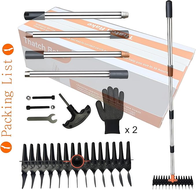- 🌱Quick Assembly, thatcher rake for Space-Saving Flexibility The thatch rake for lawn supports rapid rotation and tightening, with the rake head pre-assembled for immediate use. Adjust the length by connecting a different number of poles to suit varying heights. The dethatching rakes for lawns head is detachable, saving space during storage and ideal for compact yards