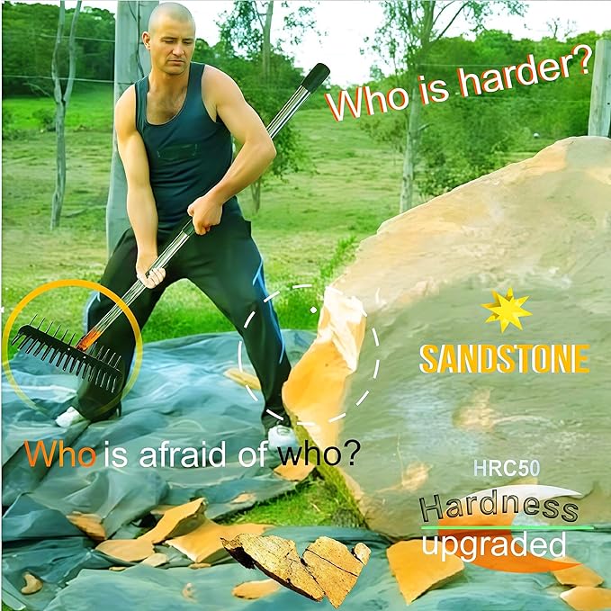 - 🌱Thickened dethatching rake Construction for Rust- and Corrosion-Resistant Durability The rake body is crafted from high-strength stainless steel with anti-rust and anti-corrosion coatings, ensuring the thatcher rake resistance to deformation or breakage. The handle is telescopic and adjustable to accommodate various heights; a plastic lining at the rake head-handle joint reinforces stability, while a rubber anti-slip sleeve at the tail end ensures a comfortable grip