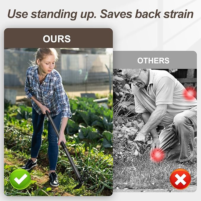 - No Bending Need: 60 Inch long overall. This hoe garden tool long handle handle is ergonomically designed to reduce the pain in joint caused by the bending of your back when doing yard work.