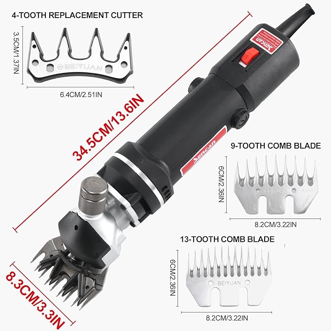 - 【NOTE】When using electric sheep shears, remember to lubricate the blades. Don't run the machine at idle. It is easy to get hot when two blades rub together. Please use the cooling spray every few minutes, take short breaks during shearing, clean the blade in time and don't run idle to prevent the blade from overheating. And Note its size and weight, it may be large and heavy for someone. Pls read the operating instructions carefully before use.