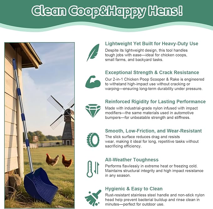 - 【Premium Materials for Rugged Construction】: Crafted from automotive-grade nylon reinforced with impact modifiers, the scoop head delivers unmatched strength and durability to withstand heavy use. Its ultra-smooth surface minimizes resistance and resists wear and tear — even under the toughest conditions. Paired with a lightweight, rust-proof stainless steel handle, this chicken poop scooper thrives in scorching heat or freezing cold without losing its edge.