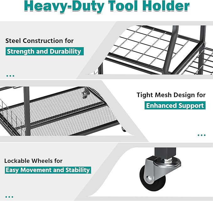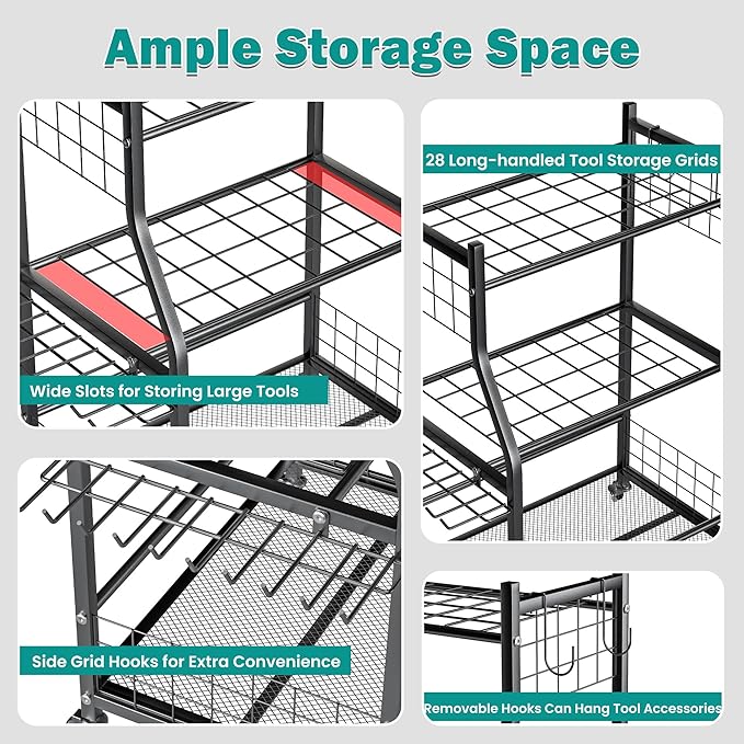 - Flexible Movement & Locking: Equipped with four heavy-duty wheels, this garden tool stand moves easily on uneven ground or grass. Two wheels feature a locking function to secure the rack in place when needed