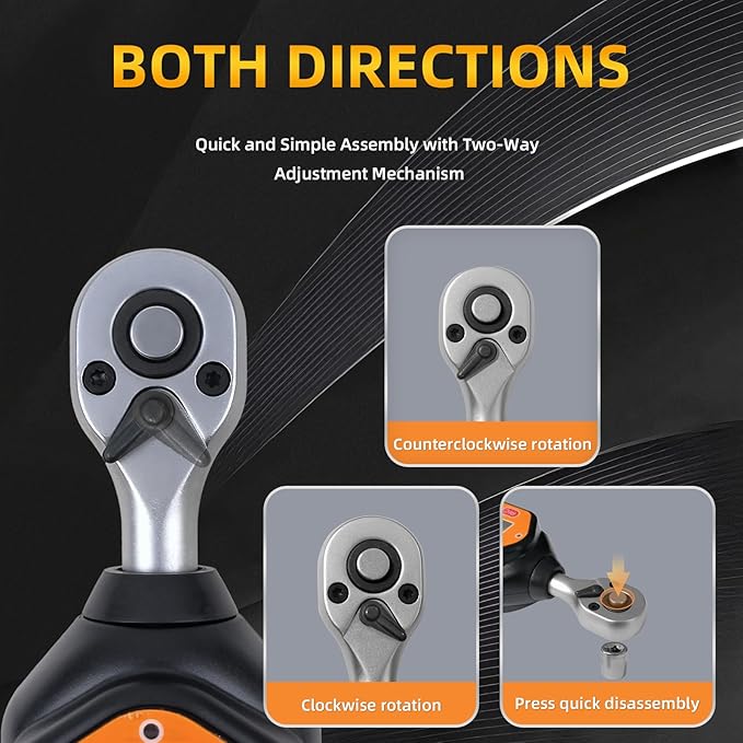 - 【Peak/Tracking Mode】The 1/4 digital torque wrench lets you work more precisely. In Tracking Mode, a real-time torque reading is shown on the digital display to help you monitor and make adjustments as you work for precise tightening. Switching to peak mode captures and holds the maximum torque value until reset, ensuring you meet all torque specifications. Designed for versatility, this wrench is ideal for automotive and aircraft maintenance. In addition, the 72-slot reversible ratchet head swings only 5°, allowing you to maneuver easily in tight spaces and change sockets quickly for increased efficiency.