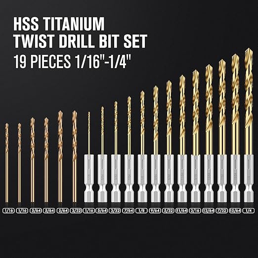 - Includes Size: 13Pcs hex shank titanium drill bits:1/16"*3, 5/64"*3, 3/32"*3, 7/64", 1/8", 9/64", 5/32", 11/64", 3/16", 13/64", 7/32", 15/64", 1/4" and 6pcs round handled cobalt drill: 1/16"*2, 5/64"*2, 3/32"*2
