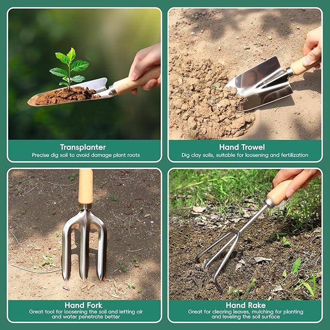 - Comfortable Non-Slip Handles: For more comfort and ease of daily use, the garden tools feature non-slip wooden handles which fit different hand shapes, practical and thoughtful. No matter kids or seniors, these gardening tools make it easy and comfortable to do your gardening work. Each handle also has a practical hanging hole for easy storage.