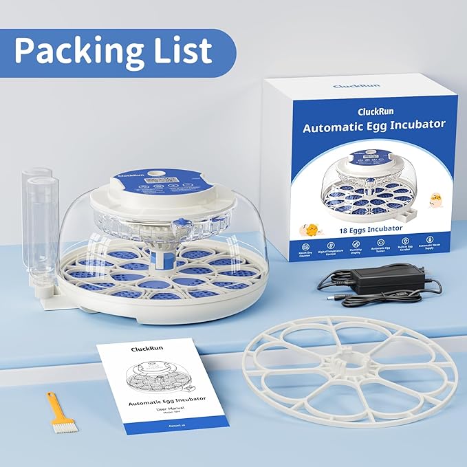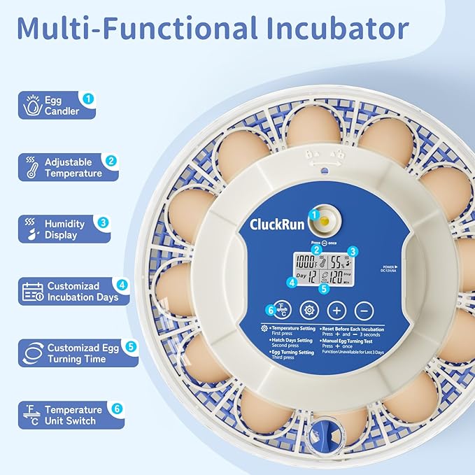 - Enhanced Egg Turning Feature: The Cluckrun 18 egg incubator features an automatic turning function that stops automatically four days before hatching, complete with a countdown timer. Customize the turning time intervals to your preference—choose from 60, 120, or 180 minutes.