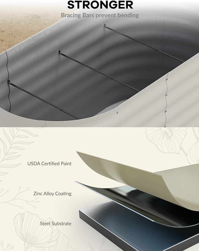- 【Upgraded Durable Galvanized Raised Garden Bed】Constructed from high-quality galvanized steel with a rust-resistant coating, this raised garden bed (8x2x1.5 ft, 0.6 mm thick) ensures long-lasting durability. Reinforced with internal support brackets, it withstands harsh weather, Long service life—perfect for outdoor raised garden beds in any climate.