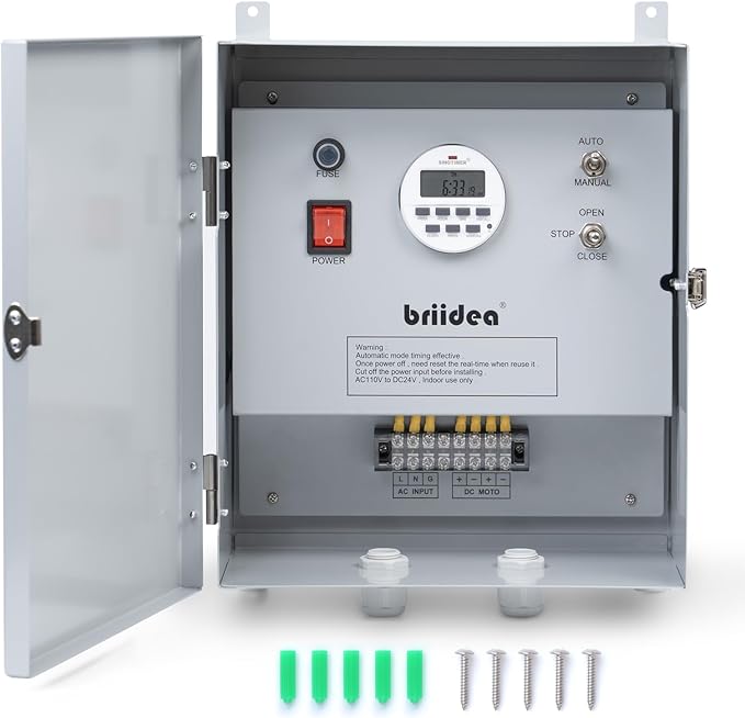 Briidea Greenhouse Roll Up Motor Timer Controller, 7-Day Programmable, AC110V to DC24V Transformer, Auto/Manual Modes, Dual Output for Side & Roof Curtain Film Roll-Up, IP65 Waterproof
