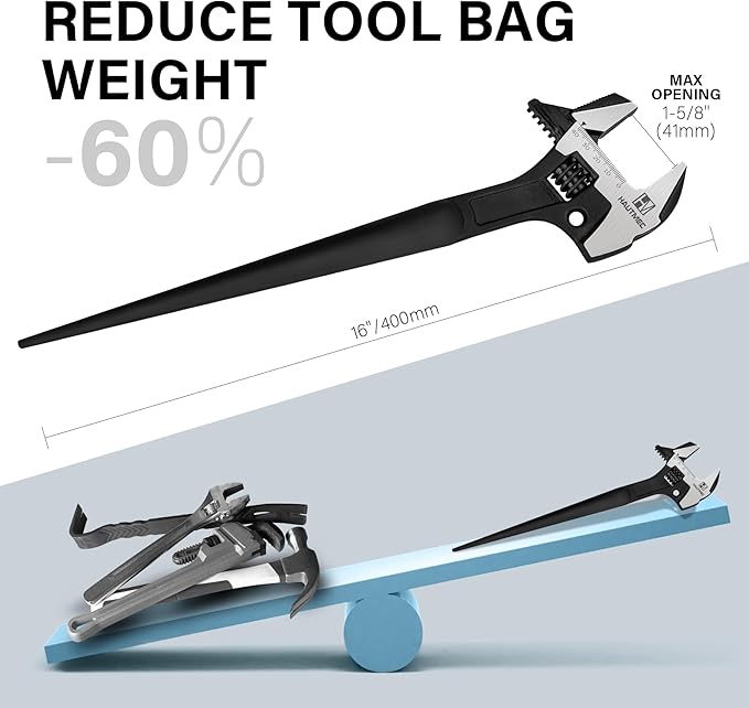 - [4-IN-1 HEAVY DUTY MULTITOOL]: Combines an adjustable wrench (1-5/8"(41mm)), pry bar, hammer head, and light-duty pipe wrench – slash your scaffold/auto repair kit weight by 60%.