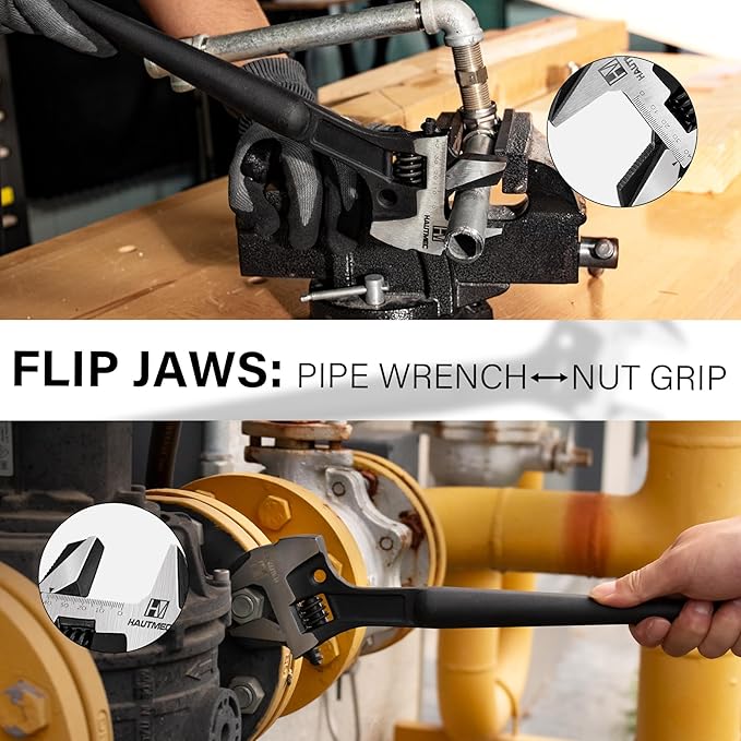 - [REVERSIBLE DUAL-FUNCTION JAWS]: Pipe wrench serrated teeth securely grip rounded pipes, while the smooth face firmly holds standard nuts – quickly flip the hook jaws without tools to switch functions. Combined with an oversized knurled adjuster for smooth single-handed sizing, this wrench adapts to plumbing and mechanical tasks in seconds.
