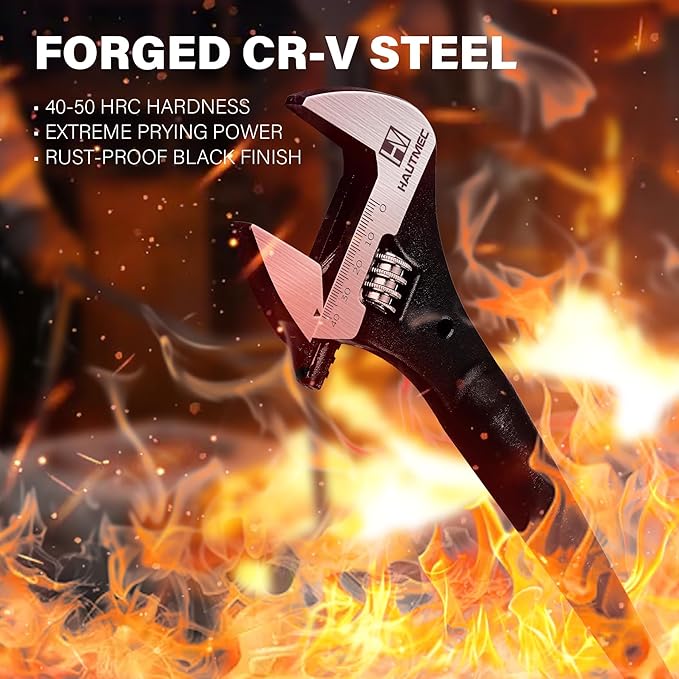 HAUTMEC 10inch Adjustable Spud Wrench, Wide Jaw Up to 1-3/16"(30mm), Adjustable Spud Wrenches with Tail Pry Bar Features, Black Oxide Finish, Forged CR-V Steel Metric & SAE Scales with Tether Hole