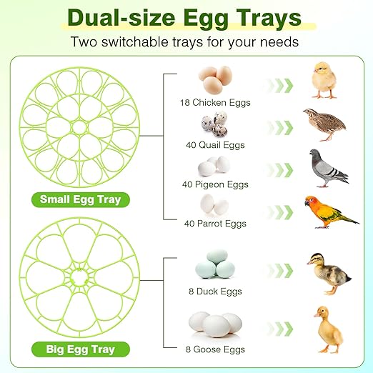 - Easy to clean: The incubator's detachable design and removable trays make cleaning easy. The egg hatcher incubator comes with 2 types eggs tray(8 and 18 eggs), perfect for various hatching needs, suitable for hatching chicken, duck, quail, parrot or bird eggs