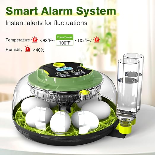- Precise Temperature: APODESS chicken incubator is built-in advanced fan and airflow system to keep the stable temperature for hatching eggs, its adjustable temperature is 60-104℉. If the temperature or humidity is out of range, the egg incubator will automatically alarm and attract your attention