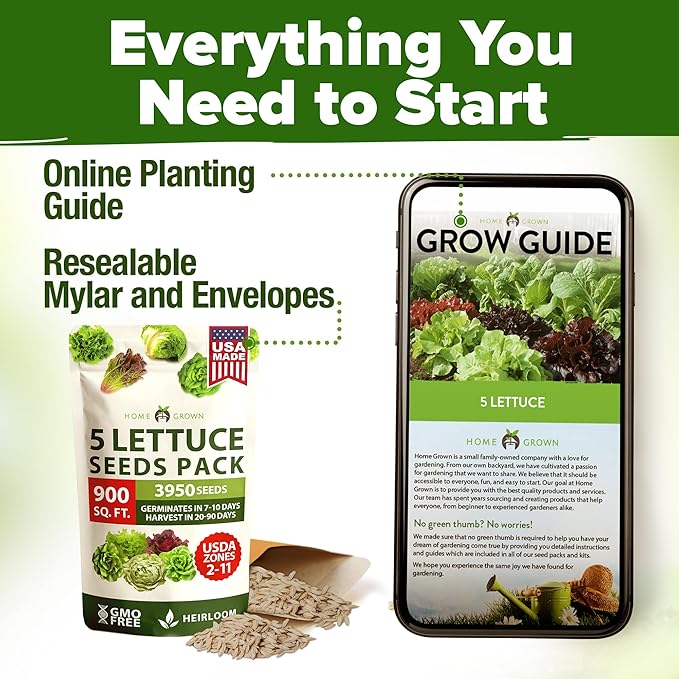 HOME GROWN 5 Lettuce Seed Pack – 3950 Heirloom Vegetable Seeds for Indoor, Outdoor, or Hydroponic Growing – Black Seeded Simpson, Red Romaine, Bibb, Buttercrunch, Iceberg Varieties (Lactuca Sativa)