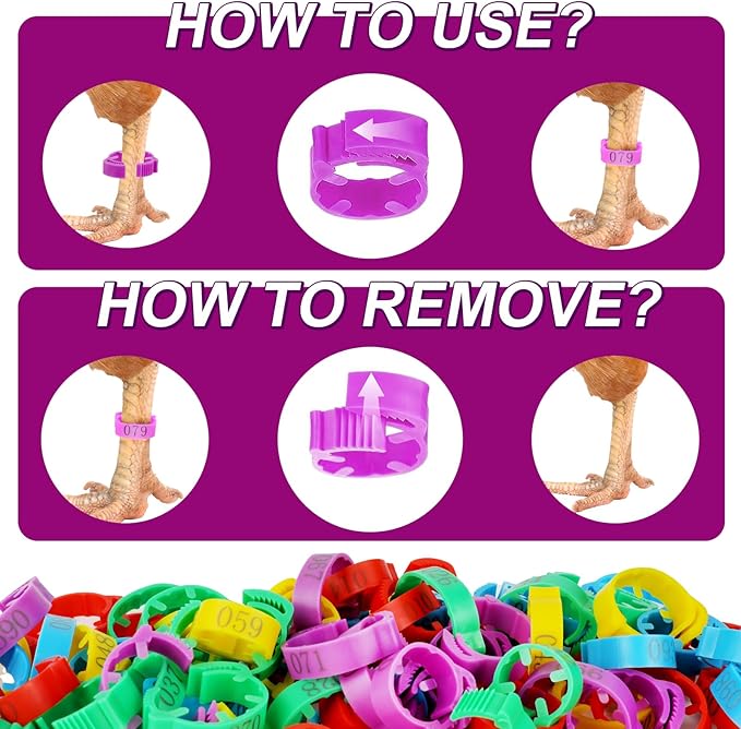 - Vibrant Colors and Ample Quantity: Each set includes 100 leg identification bands in 5 bright colors:yellow, blue, purple, red, and green, making it easy to differentiate between breeds at a glance. The laser-etched lettering is durable and resistant to fading, ensuring long-lasting visibility for all your poultry management needs