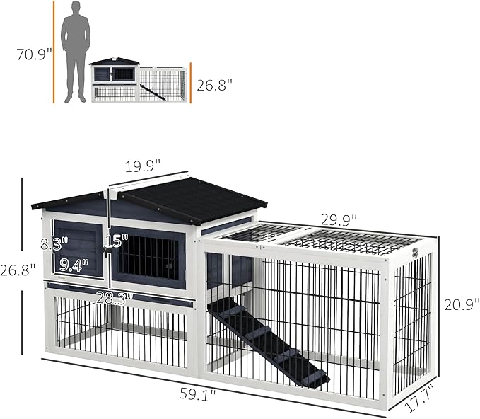 - Outdoor Rabbit Cage Info: Overall Dimensions: 59.1" L x 19.9" W x 26.8" H. Main House Dimensions: 28.3" L x 17.7" W x 15" H. Assembly Required.