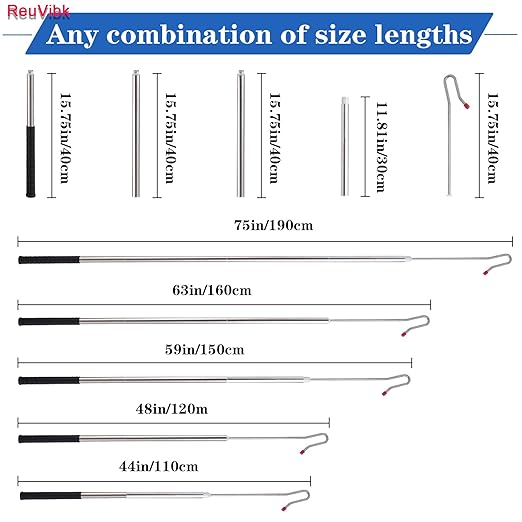 - Any combination of length 3 roots x 40cm stainless steel tubes + 1 roots x 30cm stainless steel tube + 1roots 40cm stainless steel hook, you can combine any length you want, 44"48"59"63"75", The handle is rubberized, comfortable to the touch, non-slip texture. The arc eight-mouth design makes it easier to catch sheep, and the head rubber prevents scratching the sheep's legs, 1Made of 10mm solid stainless steel and it will not twist when used.