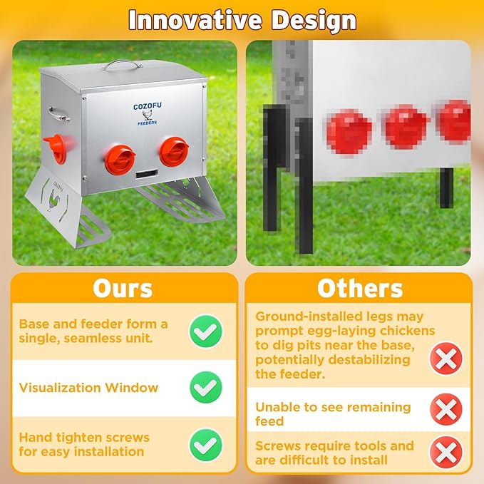- 2. Anti-Spill Design Reinforced side handles allow single-handed refills, while sloped feeding ports reduce waste by 78% compared to standard models. With its automatic gravity-fed design, this feeder minimizes spillage to keep your chicken's eating area clean and tidy - helping you save money on food costs
