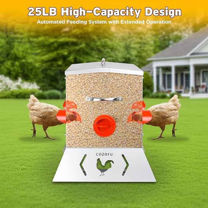 - 1. Meidum Capacity with Feed Level Visibility Holds 25lbs of pellets to sustain 6 chickens for weeks. New transparent viewing windows let you monitor feed levels without opening the lid. Reduces refill frequency by 60% through gravity-flow technology