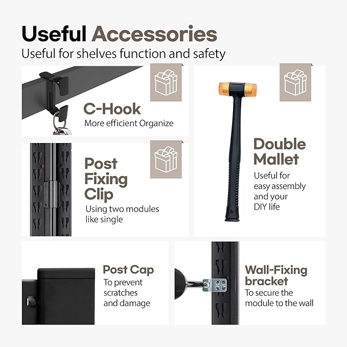 - EASY BOLTLESS ASSEMBLY (MALLET INCLUDED) – No bolts or nuts required. Simply slide and lock parts together using the included Rubber Mallet. Shelves are height-adjustable in 1.18-inch increments.