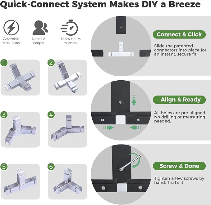 - 【REVOLUTIONARY FAST & SECURE ASSEMBLY】 Spend less time building and more time gardening! Our patented Click-Lock connectors allow aluminum beams to snap securely into place—no drilling or welding required. This innovative design makes setup 60% faster than traditional greenhouse kits. For exceptional stability, secure this larger model with ground spikes or a pre-dug trench. Apply glass glue between panels for a perfect waterproof seal, ensuring it stands strong against the elements.