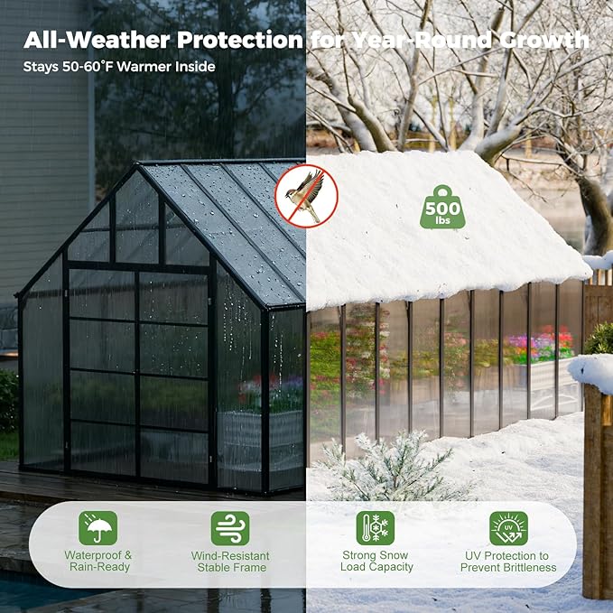 - 【ENGINEERED FOR ALL SEASONS】 Grow with confidence in any climate! Our greenhouse is built for year-round performance, featuring a heavy-duty aluminum frame and a reinforced structure. It confidently withstands winds up to 80 mph and heavy snow loads of 40 psf. The 4mm twin-wall polycarbonate panels transmit 70% of nourishing sunlight while blocking 98.9% of harmful UV rays, creating a safe and optimized paradise for your plants.